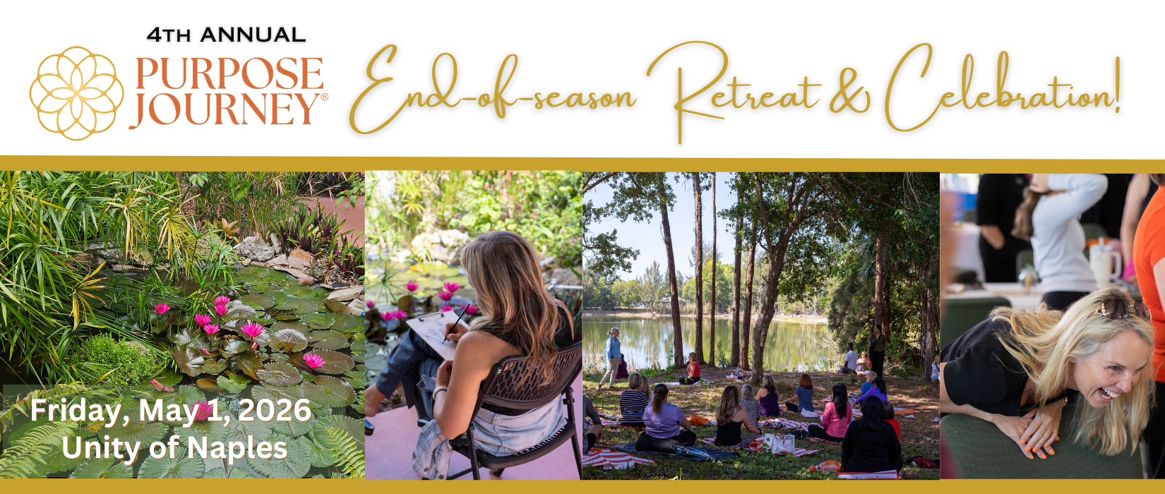 Friday, May1, 2026, you will enjoy morning outdoor replenishment experiences on Unity of Naples' sprawling wooded campus featuring a lake, meditation trail, labyrinth, and stunning natural beauty. The energy kicks up after lunch with invigorating, inspiring connection, as well as playful activities with retreat favorite The Naples Players. We close the day with a celebration toast, reception, and live music.